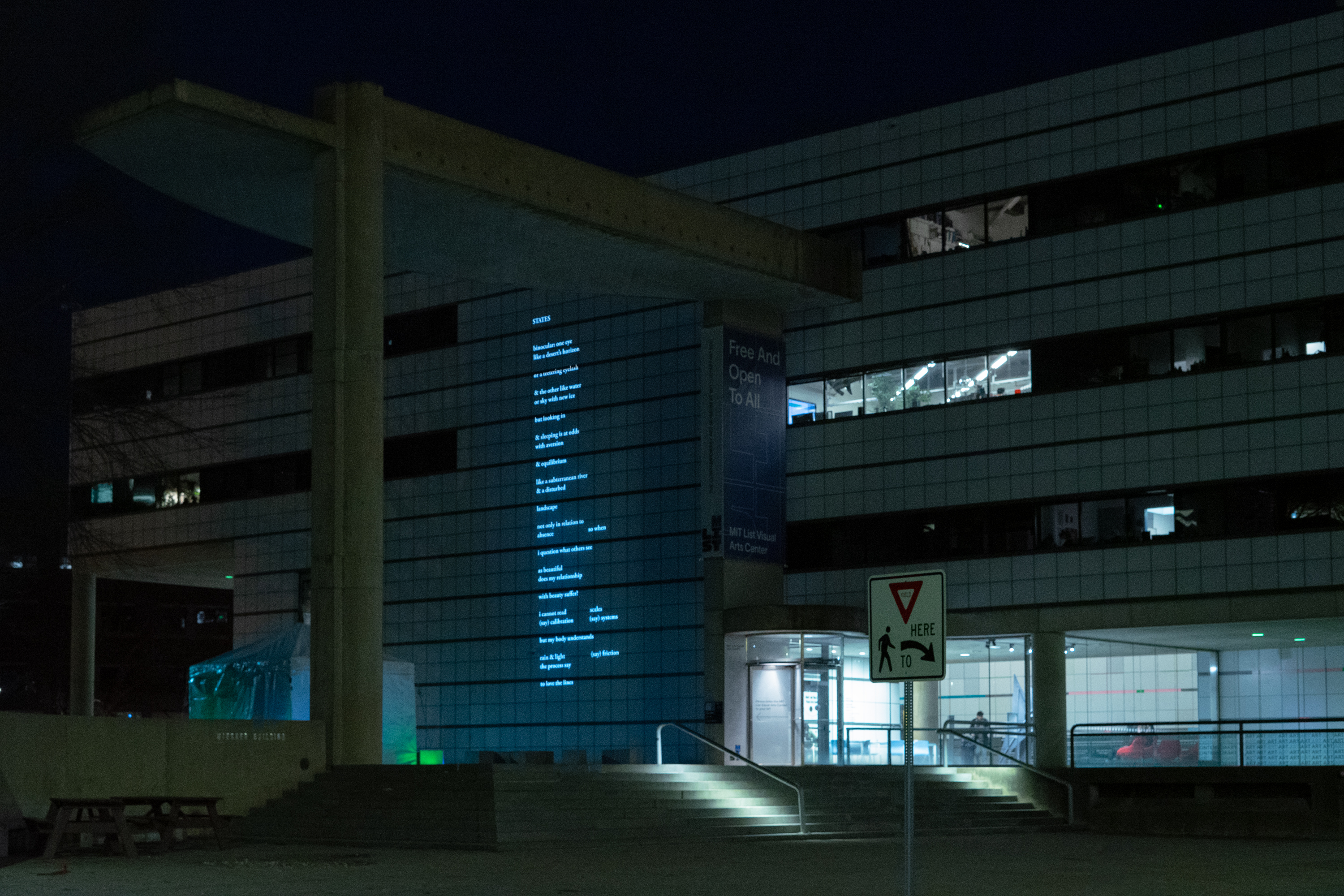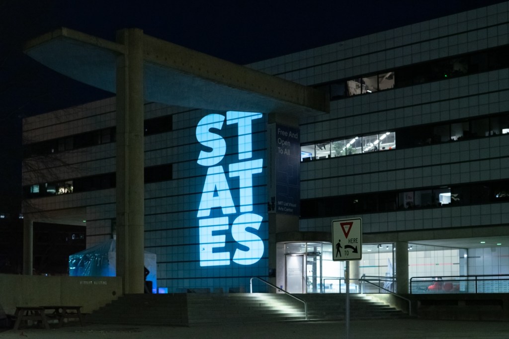 Videos featuring kinetic typography will display portions and the complete text of Kevin McLellan’s poem “States,” projected onto an exterior wall of the MIT Weisner Building.